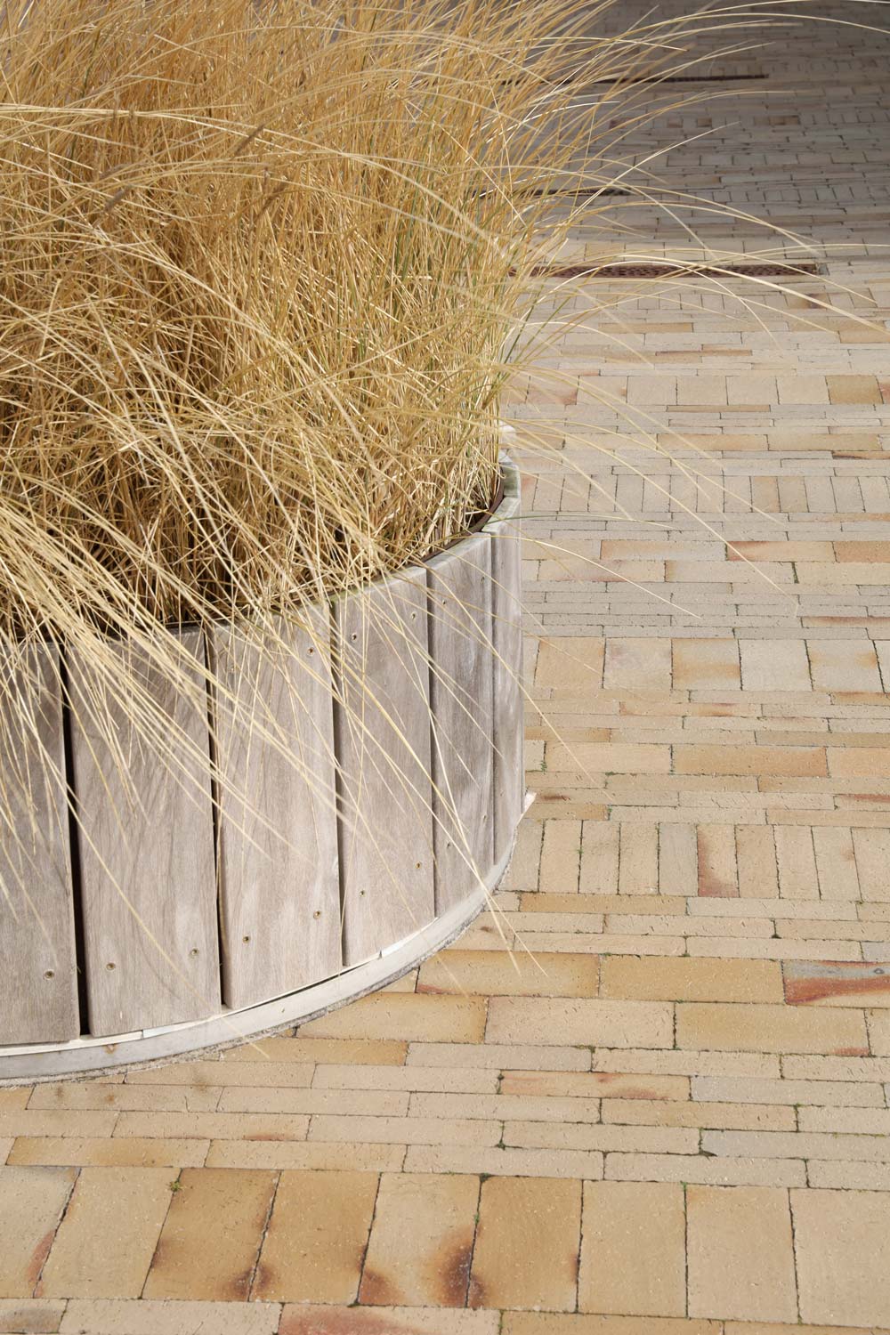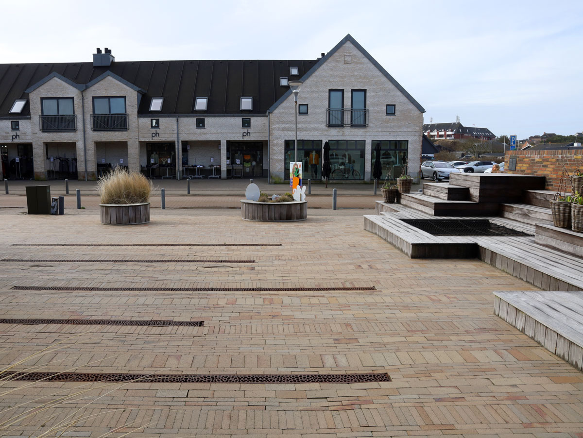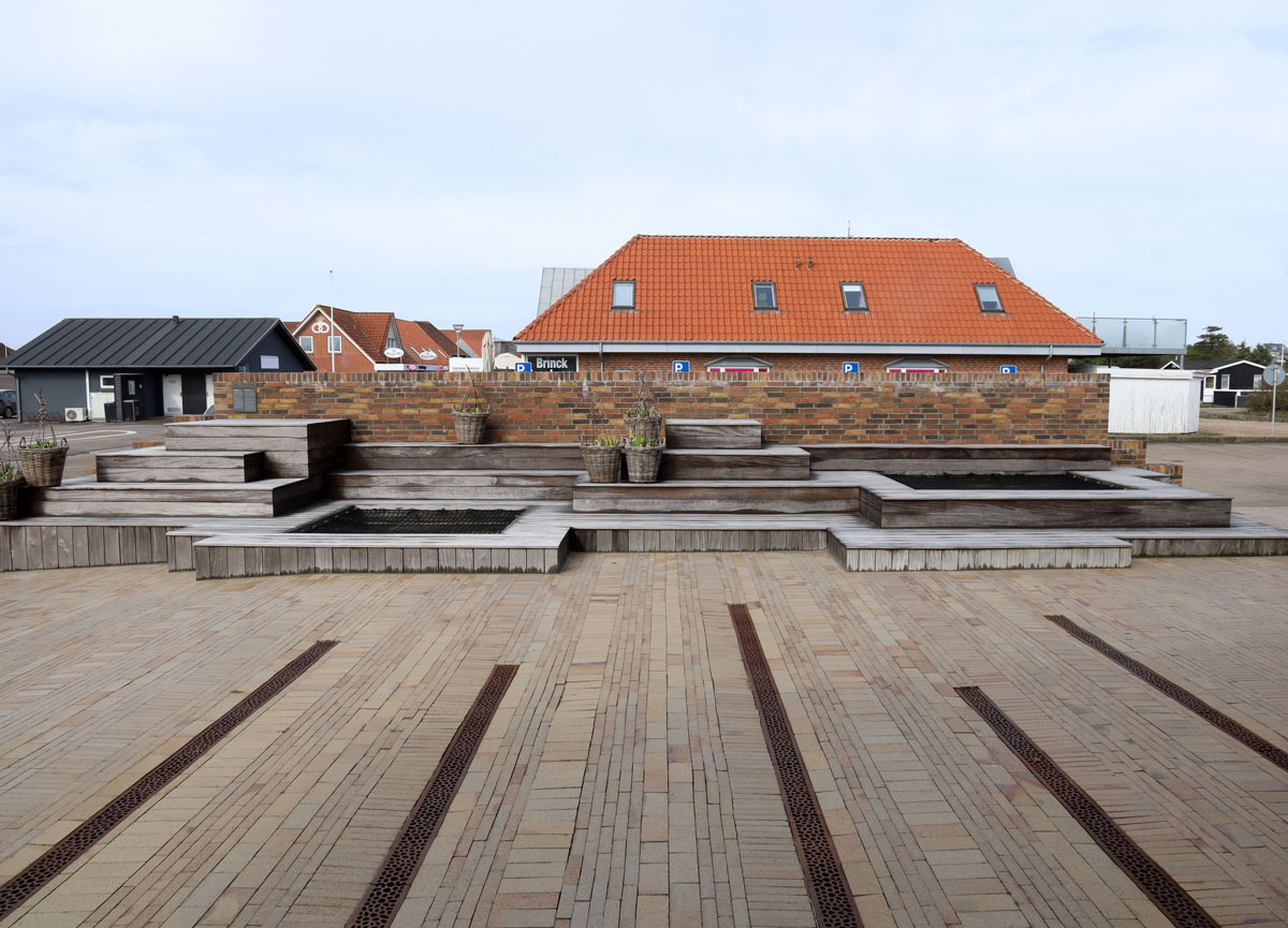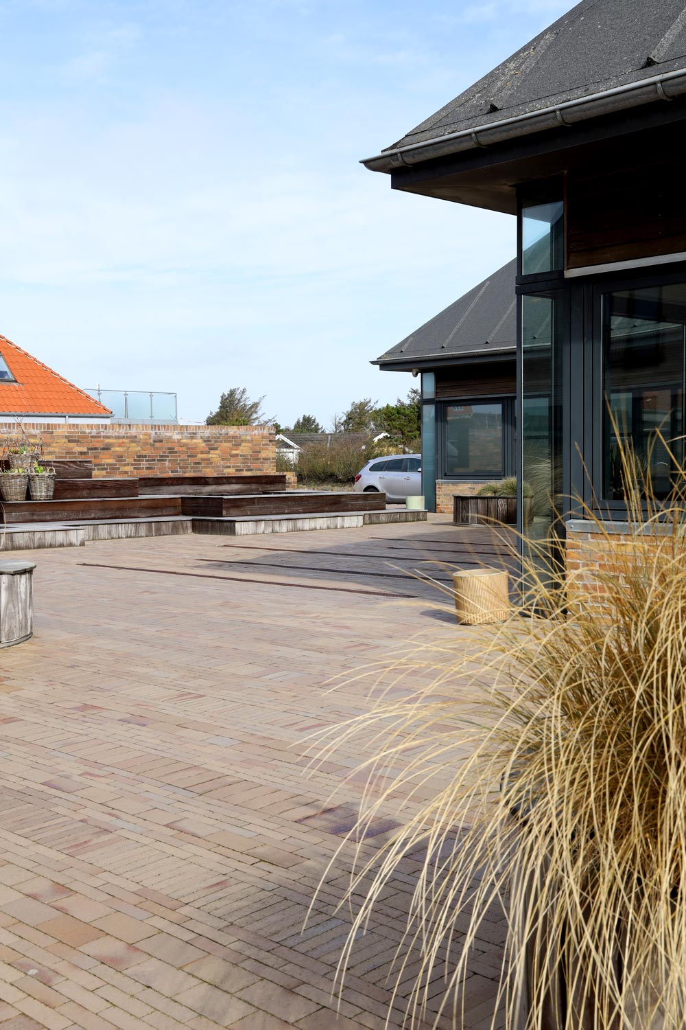 Gulvet er lagt i sandfarvede tegl af typen Søndervig Lys, som leder tankerne hen på sandrevler på havets bund. Det særlige mønster giver gulvet liv og gør det til en oplevelse i sig selv – både ude og inde. Indendørs er gulvet lagt i samme nuance og mønster som udendørs, hvilket skaber en naturlig sammenhæng mellem rummene.