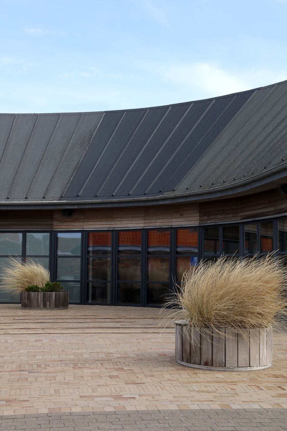 “Inspirationen til rummet er hentet i naturen omkring Henne Strand. De lyse, sandfarvede tegl er lagt i et specialdesignet revlemønster, og planterne i kummerne er inspireret af naturen omkring.”