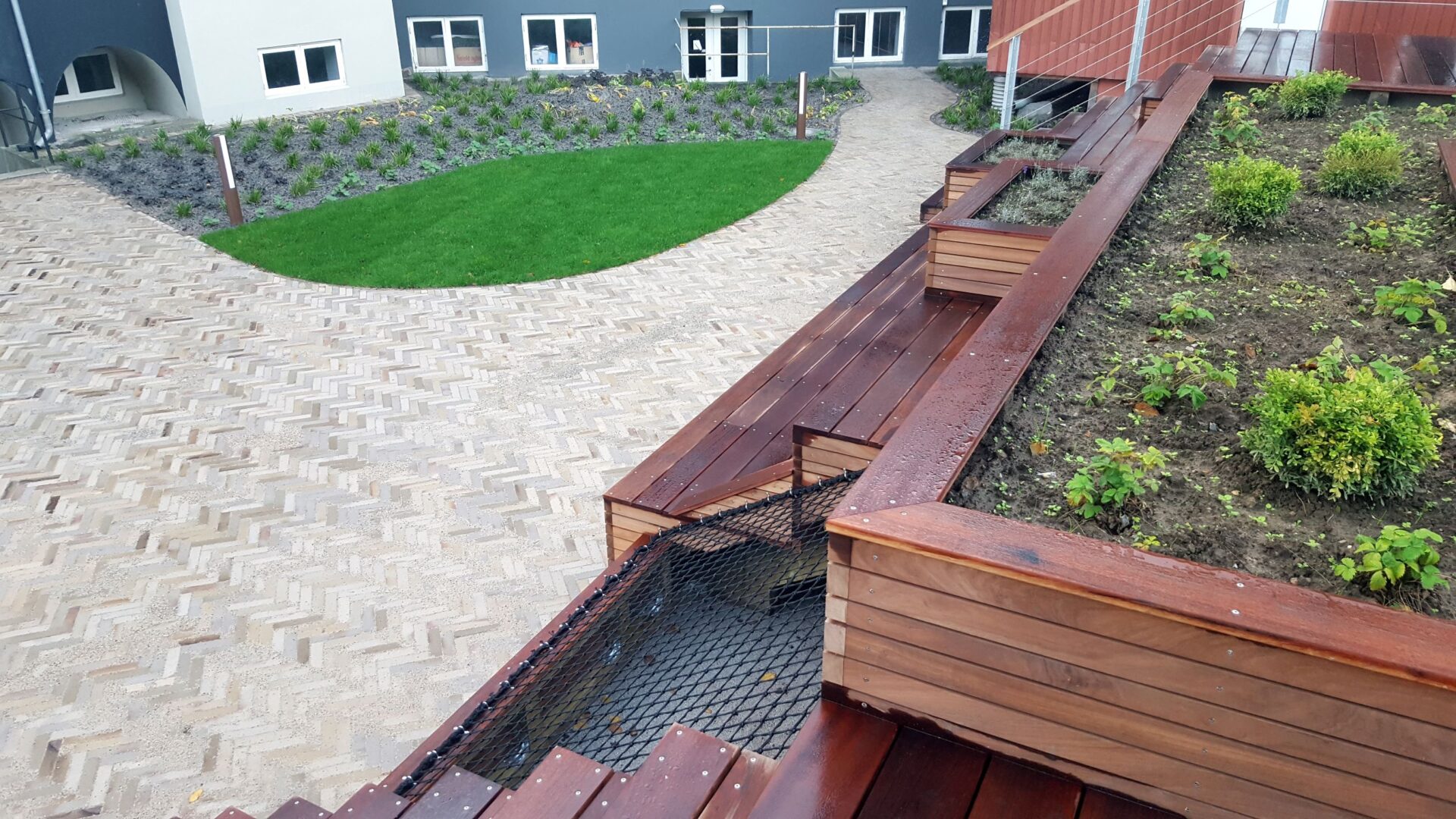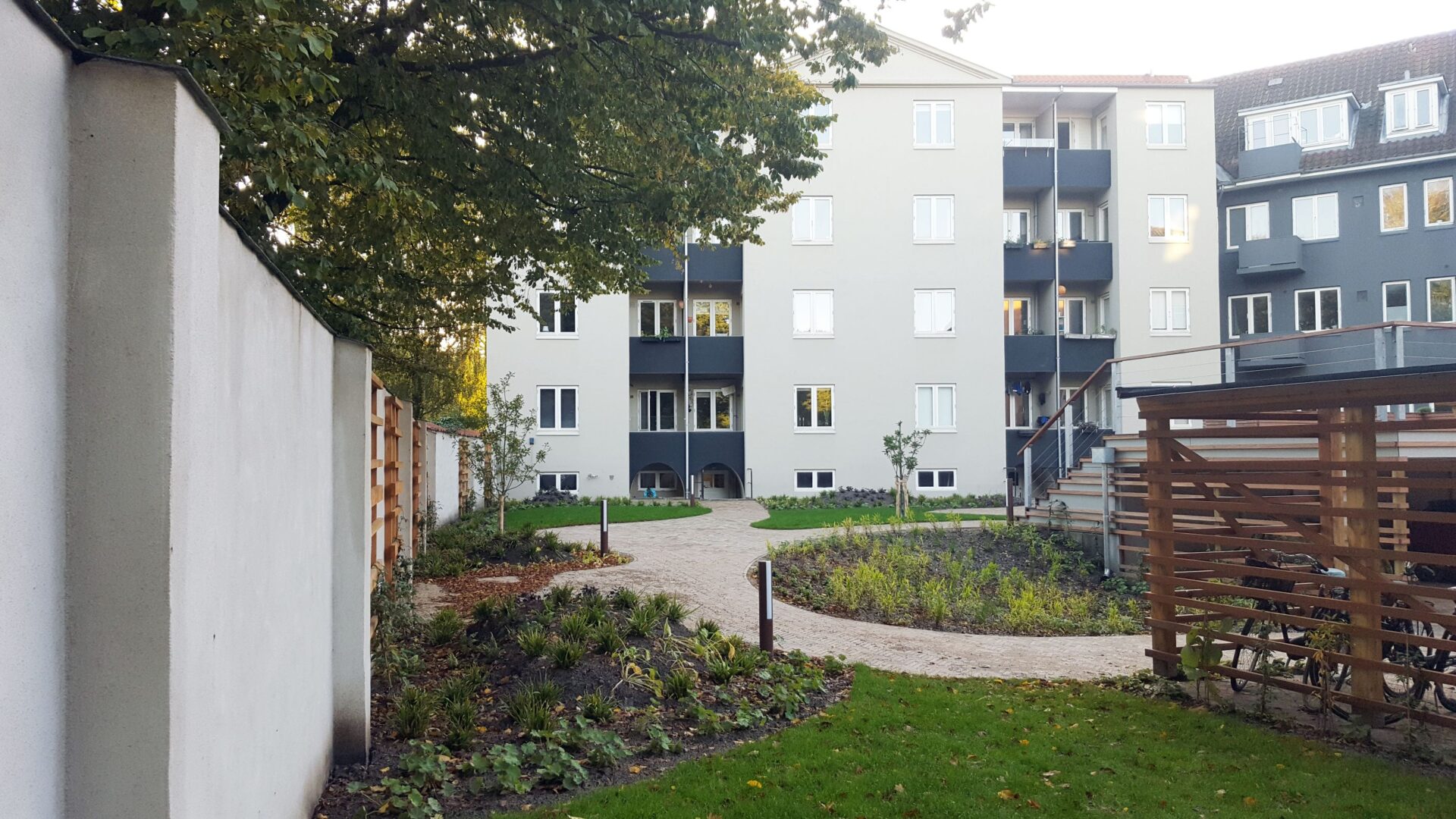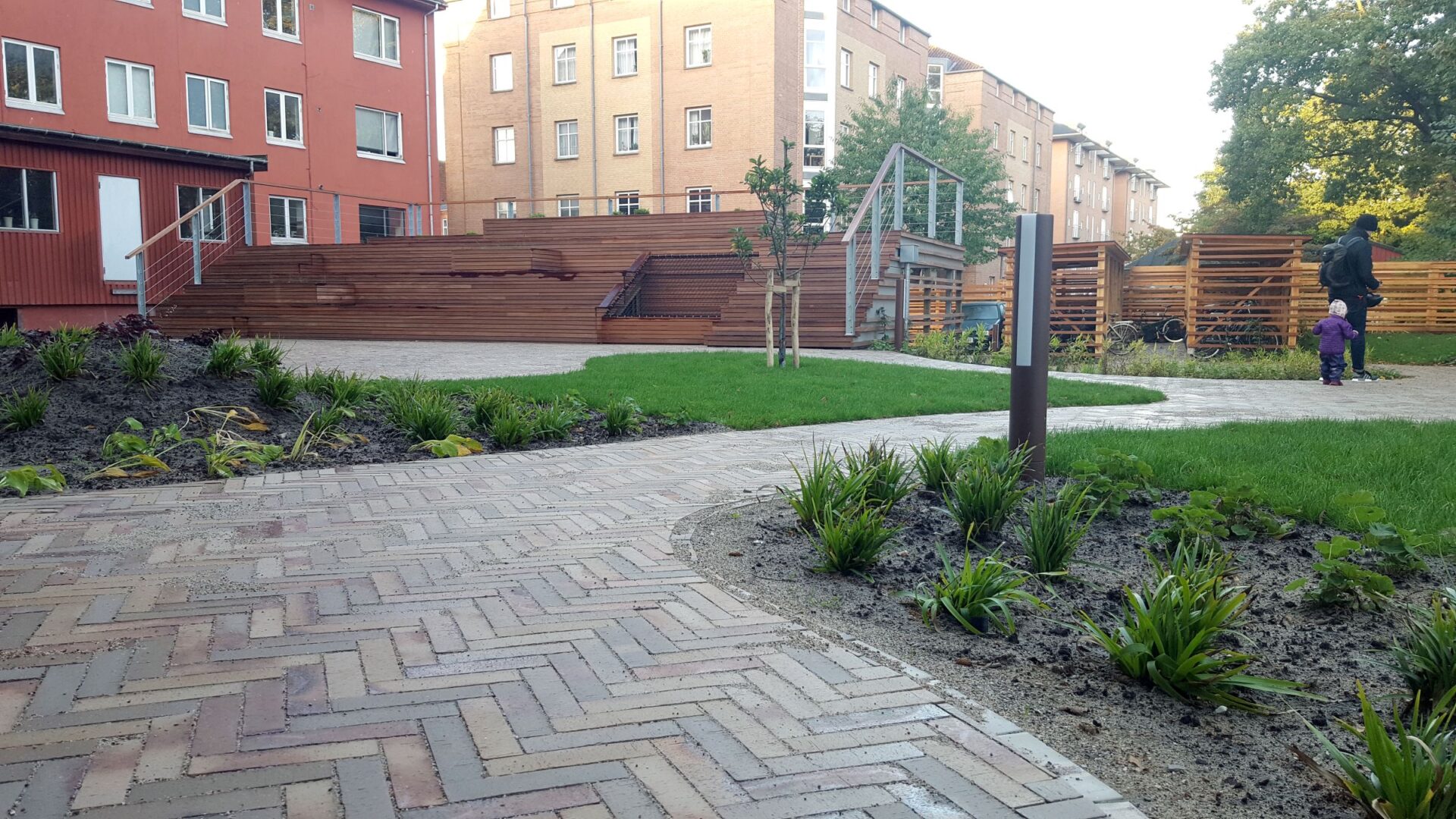Land+Mellem beboelsesejendommene på hjørnet Palnatokesvej/Nyborgvej i Odense, har Land+ skabt denne lille oase med plads til ophold og leg. Den smukke klinke står fint til elementerne i træ og giver gårdrummet et lyst og venligt islet.