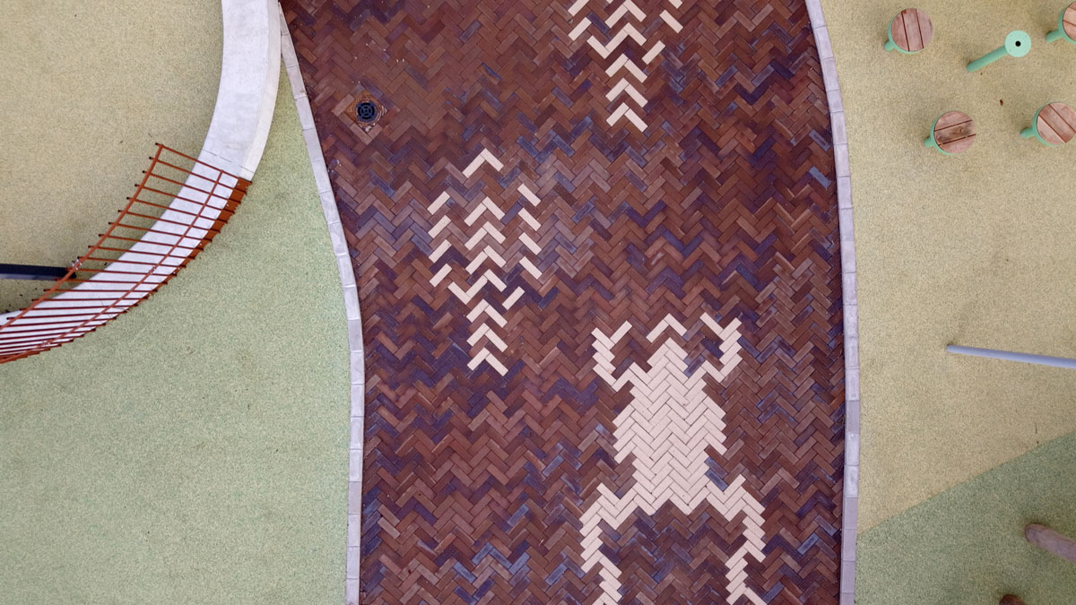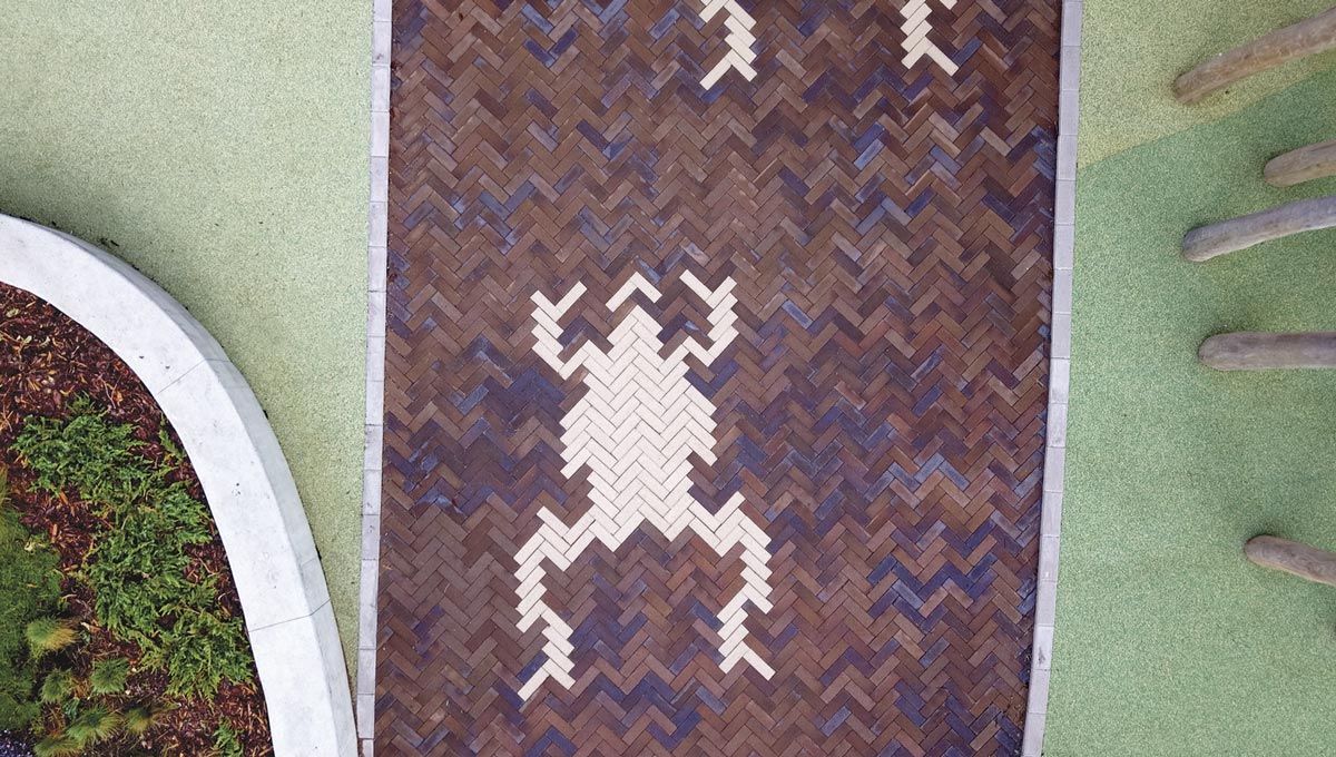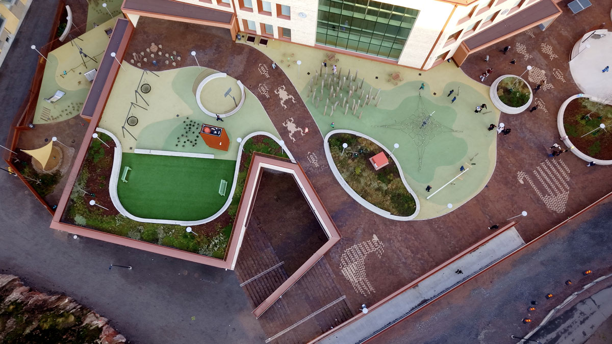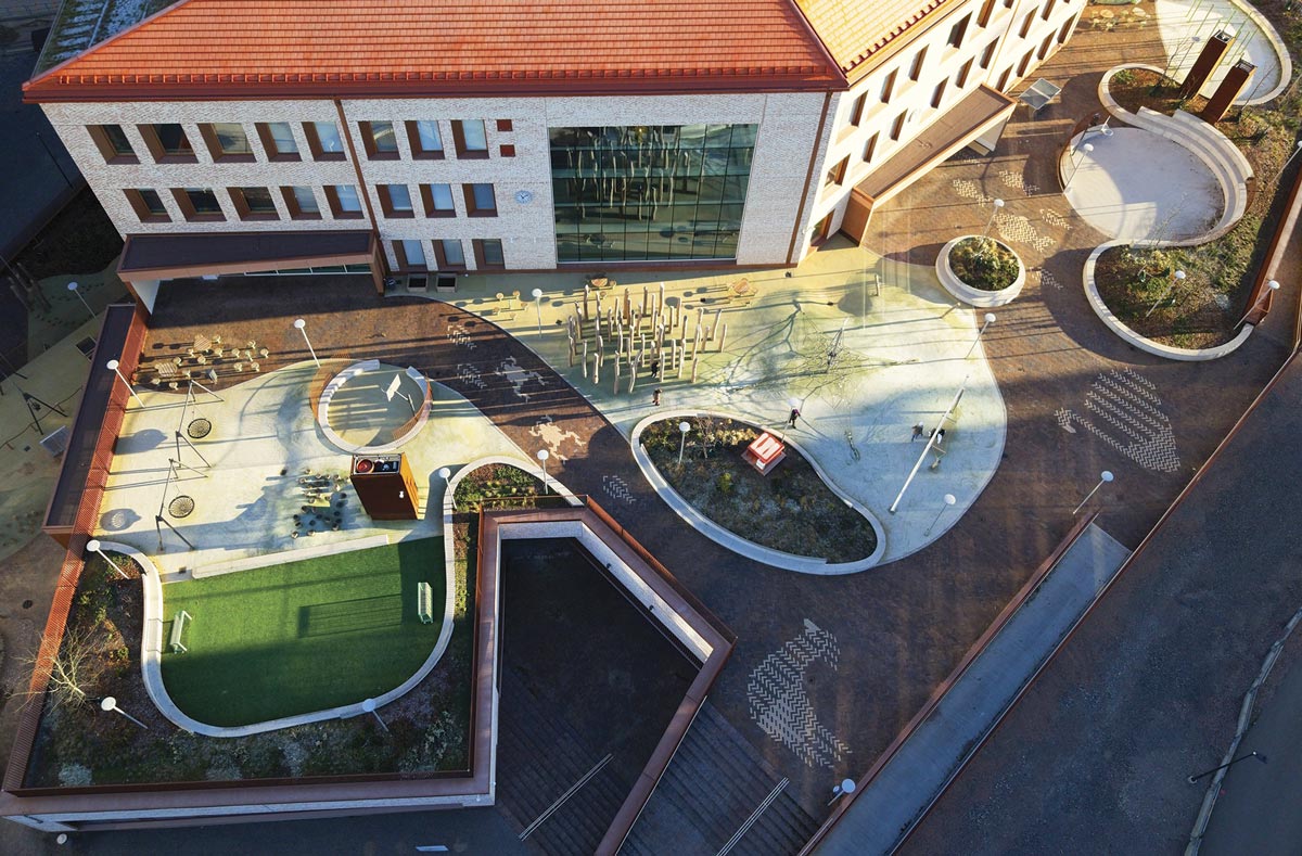 Skolens udearealer er belagt med brun-sort Gotland-klinke, der både har et flot farvespil og kulbrændinger. Mønstre og figurer er udført i Special Grå-klinke.