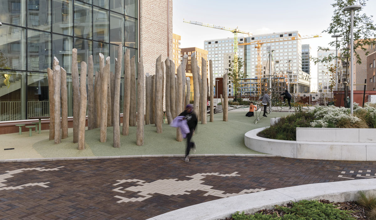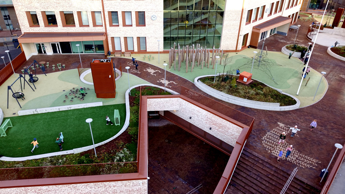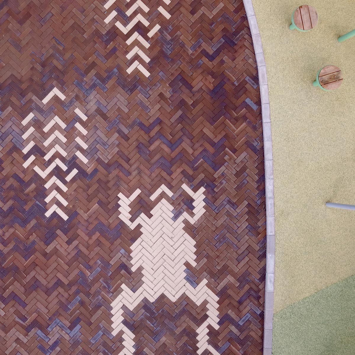 Skolens udearealer er belagt med brun-sort Gotland-klinke, der både har et flot farvespil og kulbrændinger. Mønstre og figurer er udført i Special Grå-klinke.