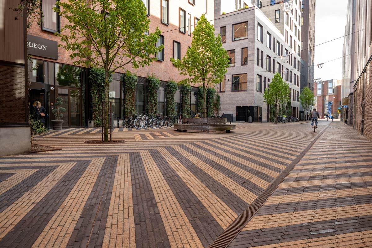 “Vi ønskede at sikre fodgængerne til og fra arrangementer i Odeon på en strækning, domineret af cykelstien. Samtidig skulle belægningen flette sig ind i den gule basistegl, som er på begge sider af pladsen. Derfor blev netop den gule Elba basisklinke brugt, med den sortbrune Manchester-klinke som kontrast. Pladsens zigzag-mønster skaber opmærksomhed for cyklisterne om at sætte farten ned.” Mette Lund Traberg / Sweco